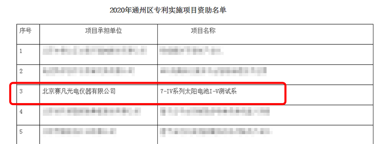 近日,2020年度北京市通州区专利实施项目已经公布,我公司的太阳能电池I-V测试系统排名第三位,荣获通州区政府科技资金支持。