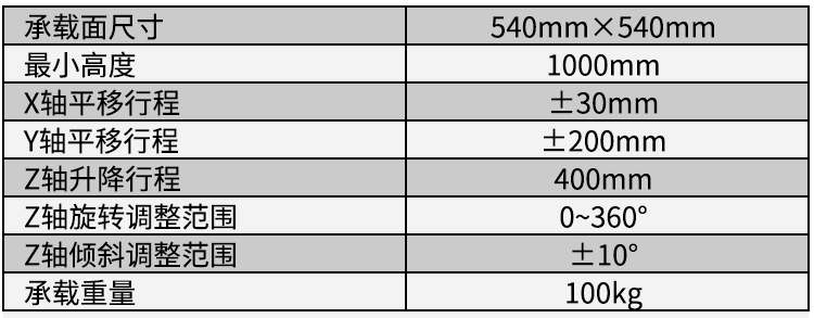 1、可实现二维平移、一维升降、一维旋转、一维俯仰调整;