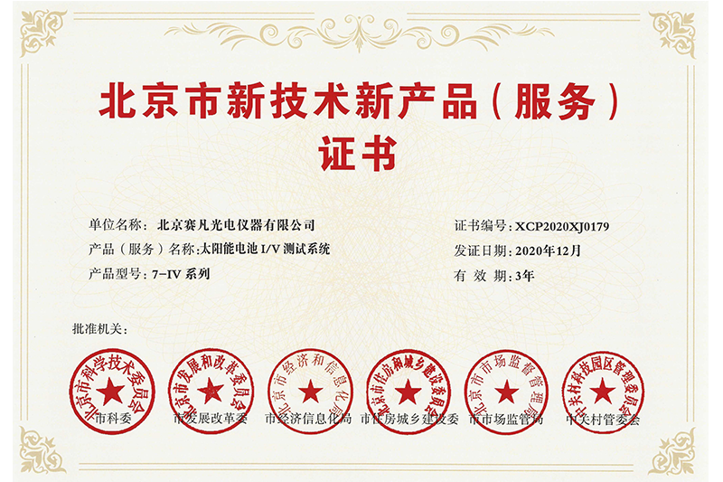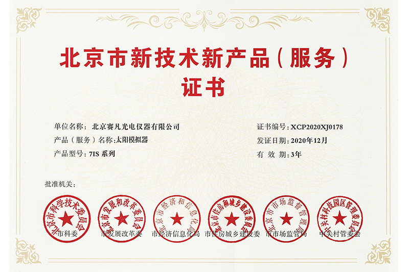 近日,从北京市科学技术委员会了解到,我司产品太阳模拟器、太阳能电池I/V测试系统、太阳能电池IPCE/QE测试系统、三光栅扫描单色仪、精密运动控制系统已获得北京市新技术新产品(服务)认证。