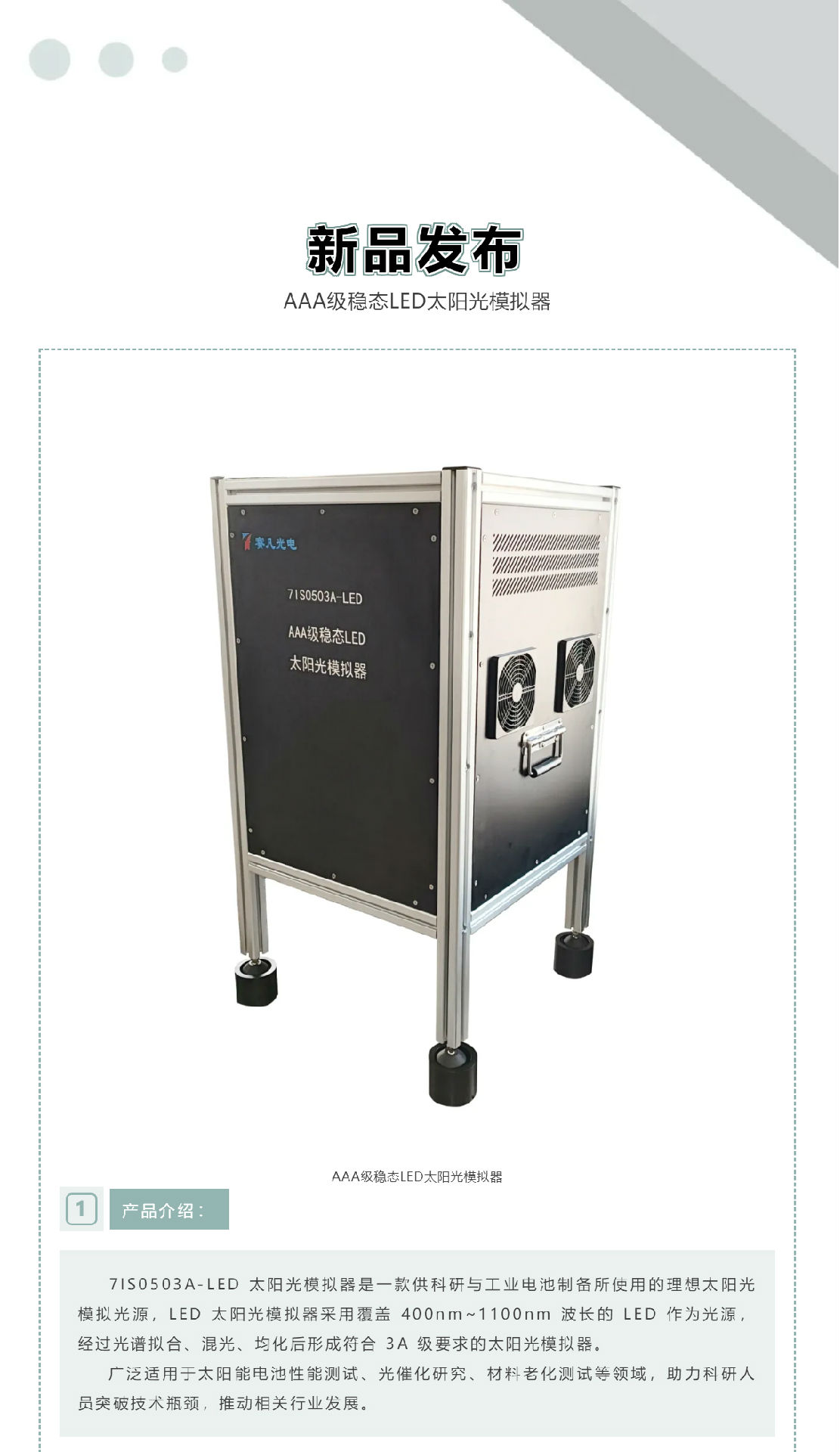 新品发布!AAA级稳态LED太阳光模拟器