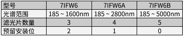 1、7IFW6系列滤光片轮设有6个档位,第一档不安装任何滤光片,第二到五档可放置直径18mm、厚度2mm的滤光片,通光口径17mm用于消除多级光谱;