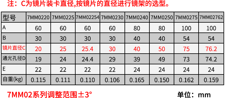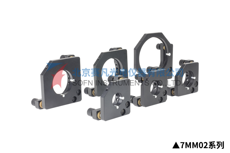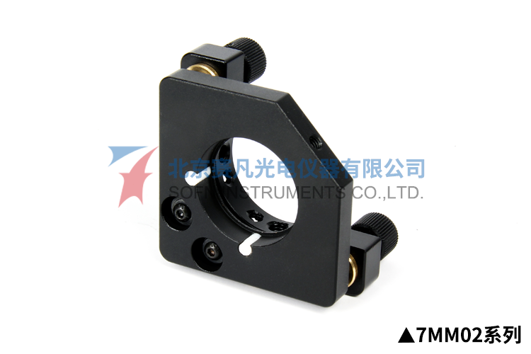 1、M6x0.25细牙螺杆调整(配铜螺母);2、碟形弹簧复位,复位力可调,从零到刚性;3、调整范围±3°;4、三点聚四氟乙烯支撑,保护镜片;5、两个方向安装孔,适合不同光路方向。