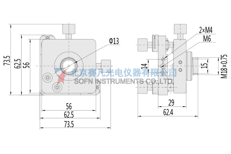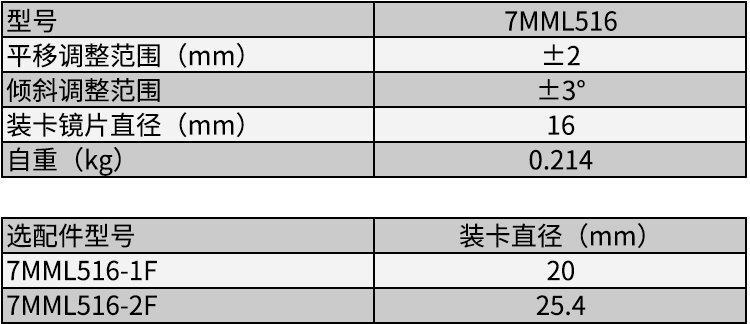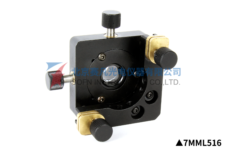 1、可将镜片两维平移,两维倾斜调整;2、 M6x0.25细牙螺杆调整,特殊铜螺母,可以轴向锁紧螺杆,防止震动松动;3、碟形弹簧复位,复位力可调,从零到刚性;4、螺纹压圈卡紧镜片;5、选配7MML516-1F/7MML516-2F改变装卡镜片直径。