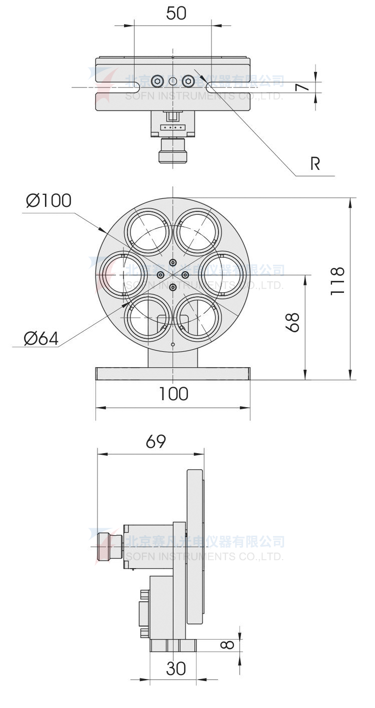 1、可夹持滤光片或其他光学元件; 2、霍尔开关定零位; 3、由专用配套电控箱7IFC6控制滤光片轮旋转; 4、更换滤光片时光路中心不变; 5、可拆卸底座,可在光学平台台面固定,也可使用支撑杆支撑固定。