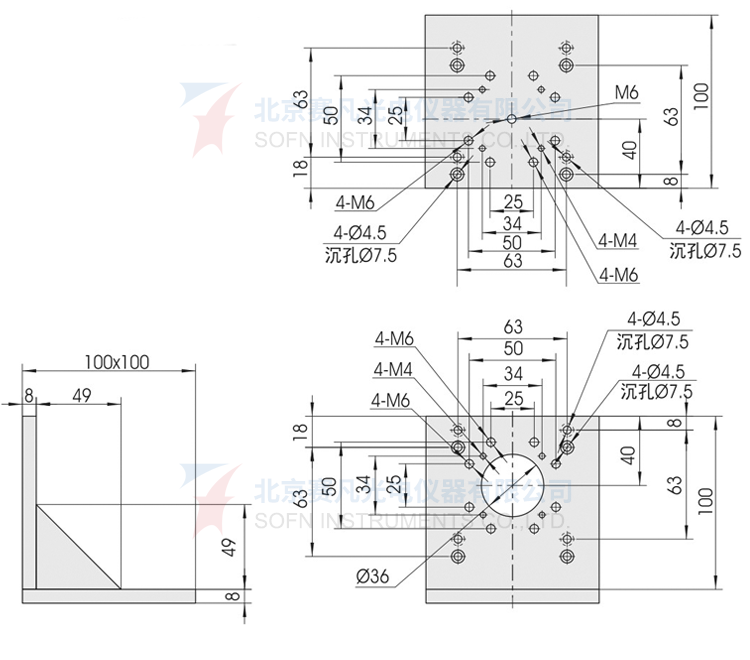 1、用于将位移台组合成两维或三维正交系统,也可将其他调整架正交组合;2、两正交面精密加工,保证垂直度要求;3、多种安装孔位设计通用性强。