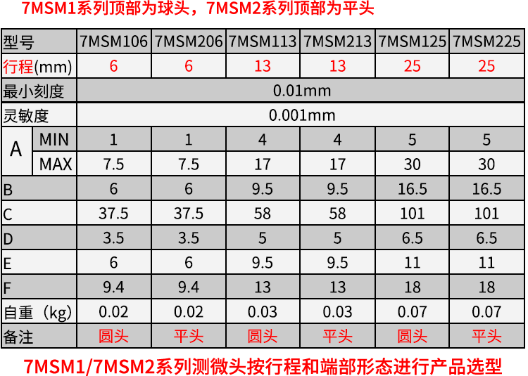 3、7MSM2系列测微头顶部为平头,适合顶球面;