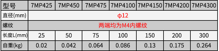 2、支撑杆直径12mm,支撑杆两端接头为M4阴-M4阴;