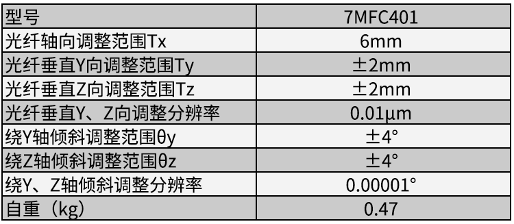 1、可提供对光纤的四个自由维度超精细调整; 2、采用细分微调结构,在Ty、Tz方向的线性调整中最小分辨率可达0.01μm,在角度调节θy、θz方向上最小分辨率可达0.00001°,调整精细,耦合更加准确; 3、可与7MFH1或7MFH2光纤卡具组合使用,夹持0.08-1.5mm直径的裸光纤。