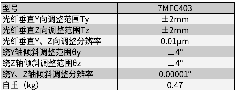 1、可提供对光纤的四个自由维度超精细调整; 2、采用细分微调结构,在Ty、Tz方向的线性调整中最小分辨率可达0.01μm,在角度调节θy、θz方向上最小分辨率可达0.00001°,调整精细,耦合更加准确; 3、标准SC接口,损耗小,耦合效率高,连接方便。