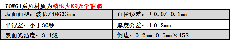 1、7OWG1系列是一种平行平面板,通常用作电子传感器或外在环境的检测器的保护膜;2、7OWG1系列材质为精退火K9光学玻璃;3、该系列产品接受特殊定制镀膜需求。