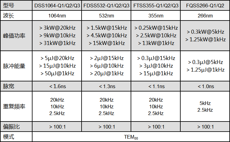 1、重复频率高达20kHz;2、峰值功率高达15kW在355nm;3、<1.6ns脉宽;4、极佳的光斑质量。
