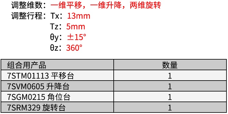 1、提供四维位移调节,一维平移,两维旋转,一维升降;2、位移调整采用测微头,运动舒适,精度高,定量直观;3、采用弹簧复位,消除轴向间隙;4、底座标准孔距的安装孔,方便安装。