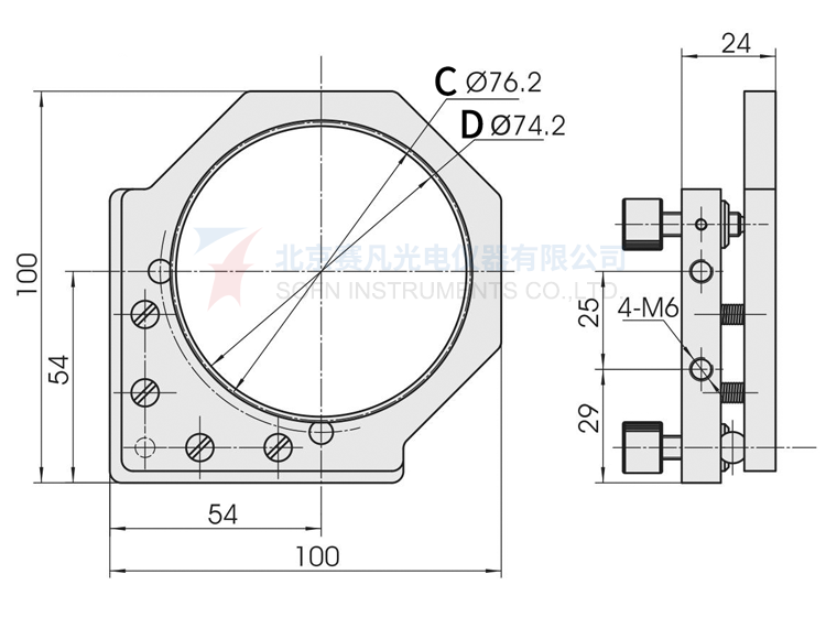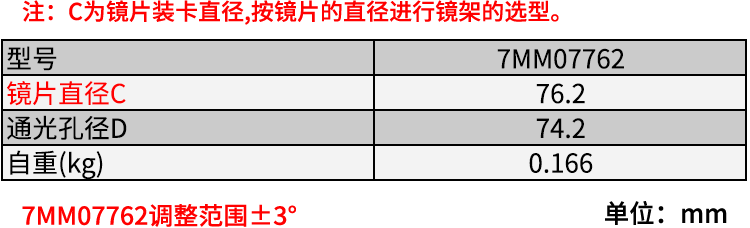 1、M6x0.25细牙螺杆调整,配铜螺母;2、高性能拉簧复位,复位力均匀,减少应力;3、调整范围±3°;4、三点聚四氟乙烯支撑,保护镜片;5、两个方向安装孔,适合不同光路方向。