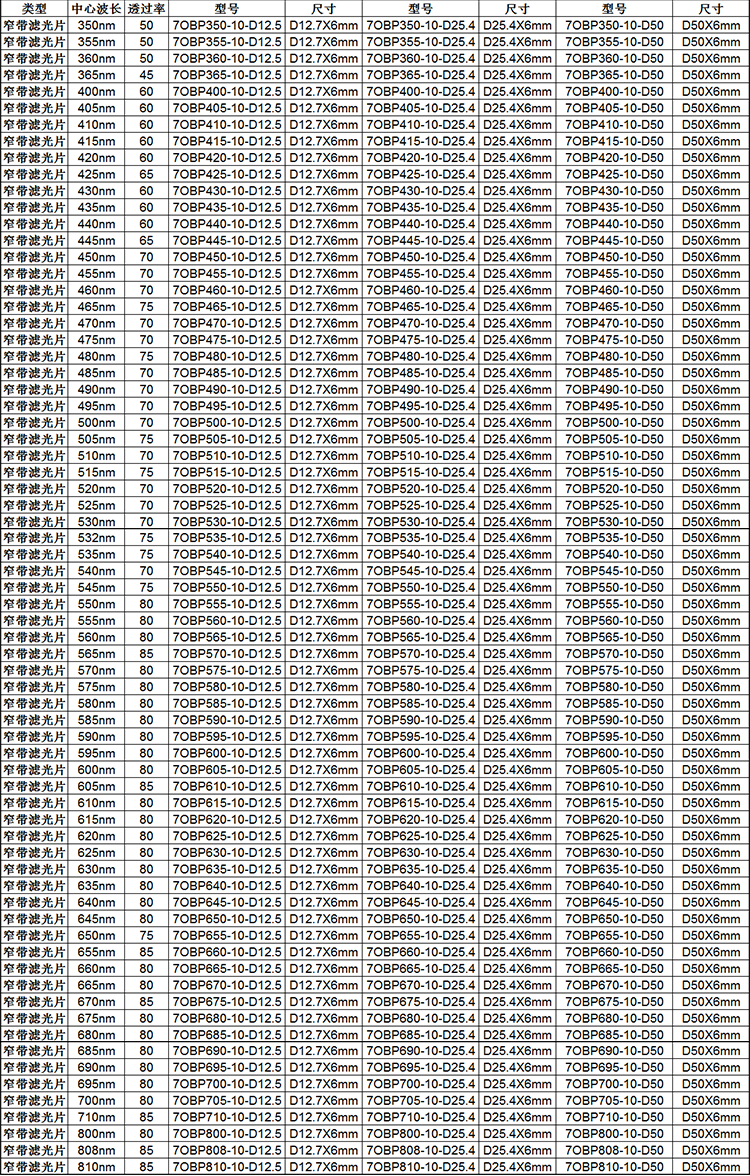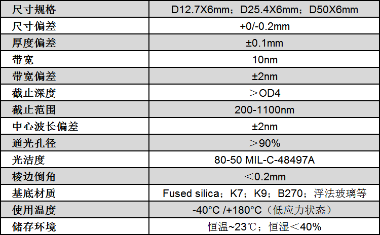 波长准确,窄带窄,精度高;采用真空结构层技术、干涉多层膜系镀膜技术、离子束辅助溅射镀膜技术等技术;带宽10nm;截止深度>OD4;截止范围最宽达到200-1100nm;科研级产品,广泛应用于科研高校研究,中高端工业仪器、分析仪器等。