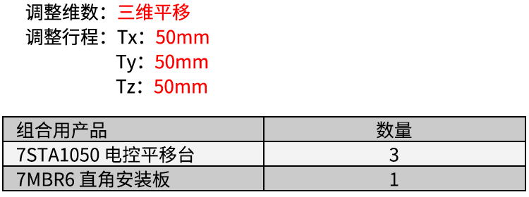1、提供三轴平移调节; 2、配有步进电机和标准DB9接口,配合7SC系列运动控制器可实现自动控制; 3、底座有标准孔距的安装孔,方便安装固定。