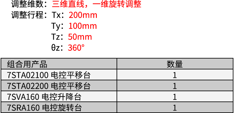 1、提供三轴直线,一轴旋转调整;