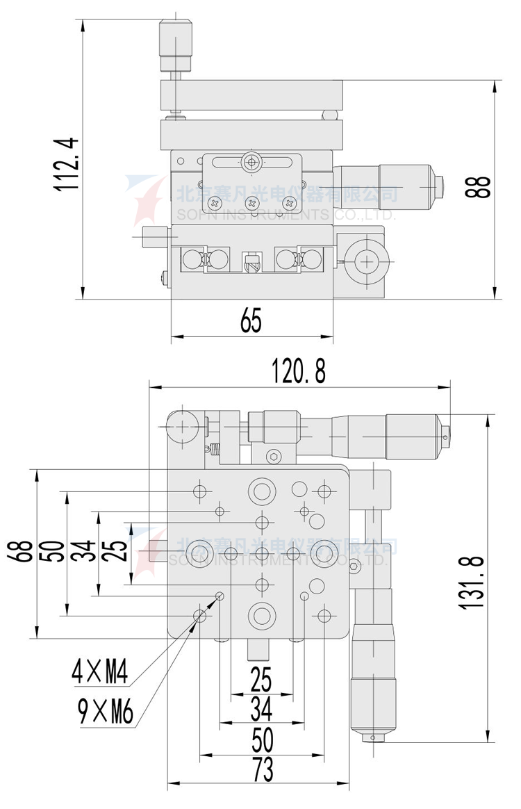 2、平移调整采用测微头,运动舒适,精度高,定量直观;
