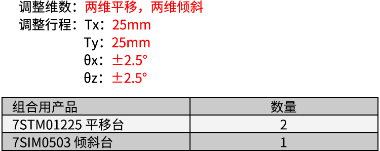1、提供四维位移调节,两维平移,两维倾斜;2、平移调整采用测微头,运动舒适,精度高,定量直观;3、倾斜调整采用细牙螺杆,灵敏度高;4、采用弹簧/碟簧复位,消除轴向间隙;5、底座标准孔距的安装孔,方便安装。