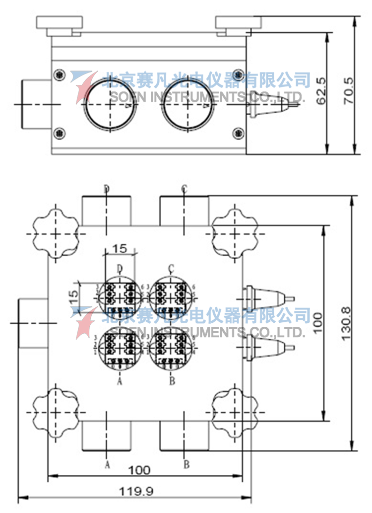 1、密闭式结构;2、石英玻璃与电池片零空气层接触;3、二线制测试;4、可同时测试4片电池片;5、电池片尺寸:15mm×15mm×1.3mm;6、探针:每组9根,共36根;7、5个拨码开关;8、2个TRB-KYD三同轴母座和2根TRB-TRB-2m三同轴电缆;9、轮廓尺寸:119.9mm×130.8mm×70.5mm。
