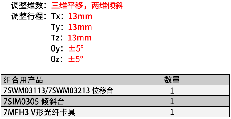 1、提供五维位移调节,三维平移,两维倾斜; 2、倾斜调整采用M6×0.25超细牙螺杆,精度高,稳定性好,三维线性移动采用测微头驱动,灵活性强,可按刻划读数;3、顶端光纤卡具可夹持3.2mm直径光纤;4、调整台左右手成对设计,方便使用操作。