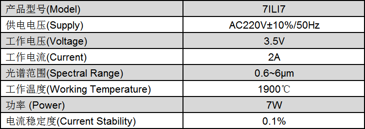 7ILI7型红外光源体积纤小,留有SR540斩波器的安装接口,可以与我公司生产的7IMS30、7IMU30、7ISW、7ISU系列单色仪配套使用,具有较宽的光谱覆盖范围和较平缓的光谱能量分布,在红外测量和研究中应用广泛。