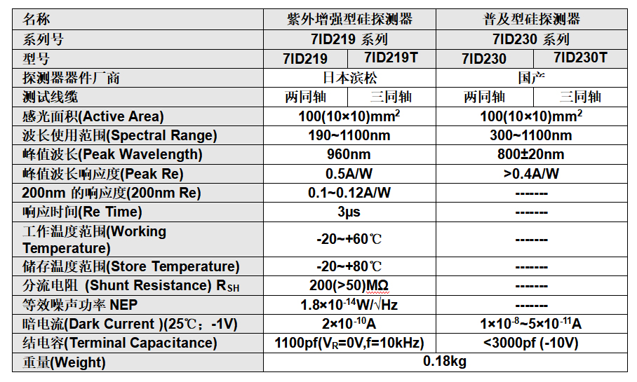 2、其中7ID219采用日本进口滨松硅光电探测器件,7ID230系列采用国产高性能光电探测器件,型号后缀不带“T”者配两同轴测试线缆,带“T”者配三同轴测试线缆。