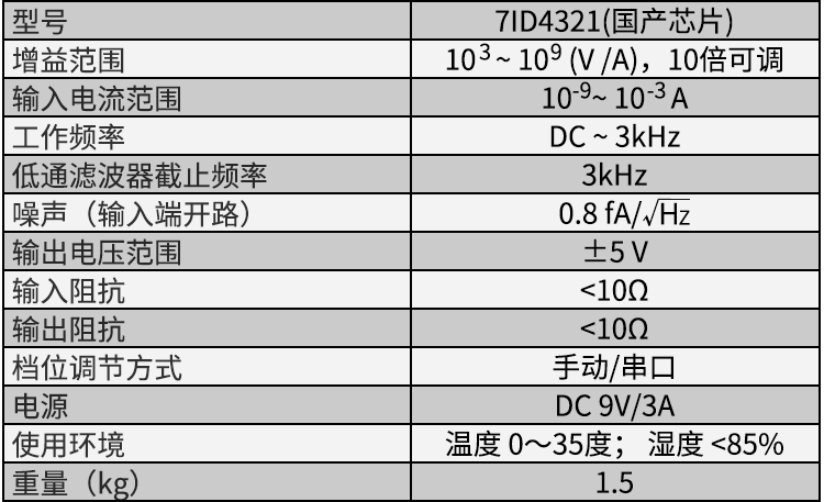 1、纯直流电流放大器; 2、低通截止频率3kHZ; 3、电流测量范围宽,从10-9到10-3A的电流信号都可以测量; 4、高放大倍数下噪音低,在109放大倍数下噪声电压峰峰值仅为二十多毫伏; 5、操作方便,放大倍数可以手动调节也可以通过串口调节。
